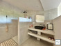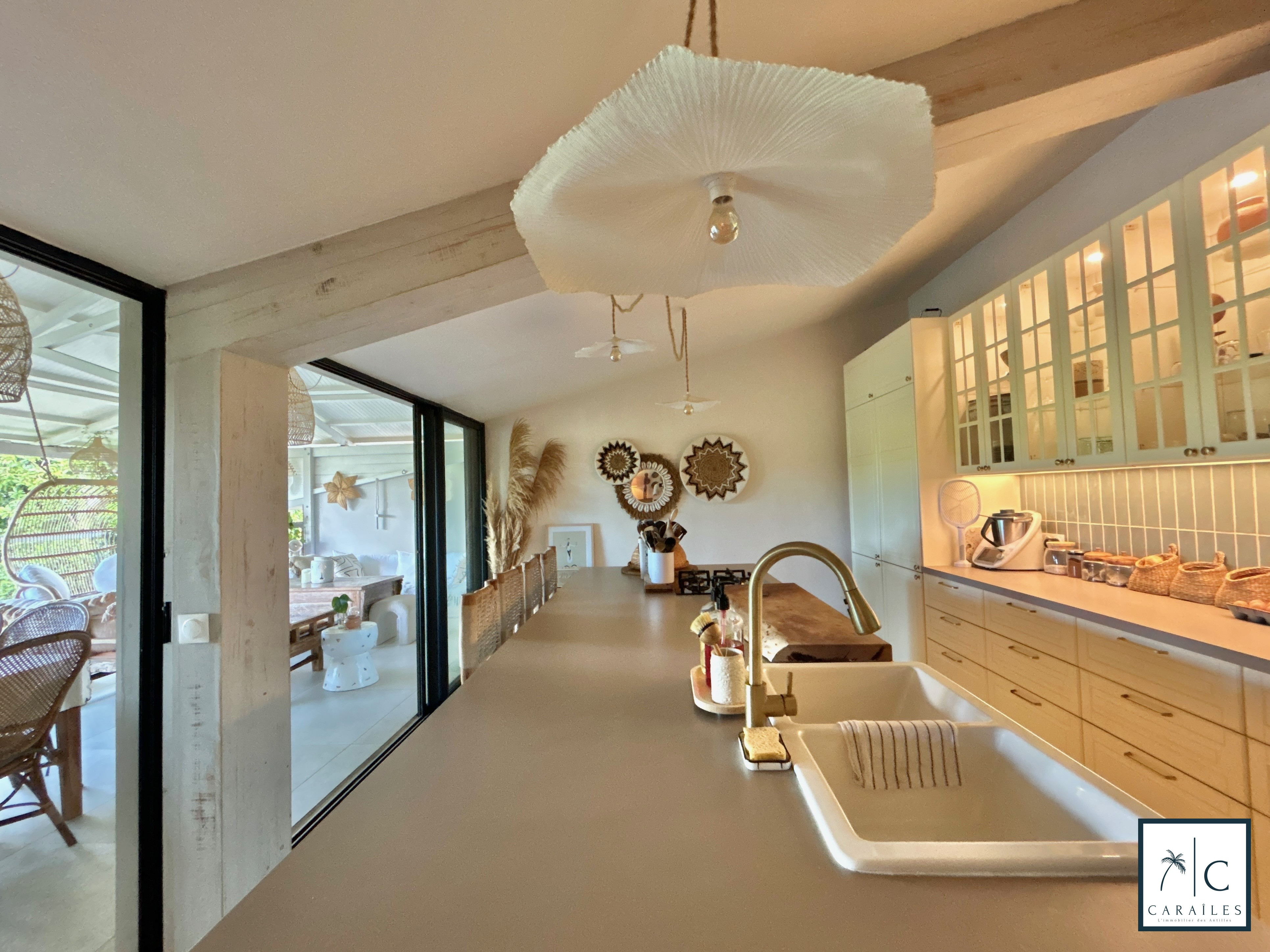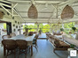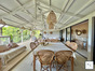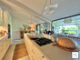 La cuisine (23 m²) d’inspiration nord-américaine, est un véritable bijou : électroménager dissimulé, armoires vitrées éclairées, grand plan de travail central. Elle s’ouvre sur une immense terrasse couverte de 44 m², suspendue au-dessus du jardin. Véritable coeur de la maison, elle est un espace de vie magique, à hauteur de cime des arbres, d’où l’on contemple les oiseaux, le manguier, et la piscine turquoise scintillant plus bas.