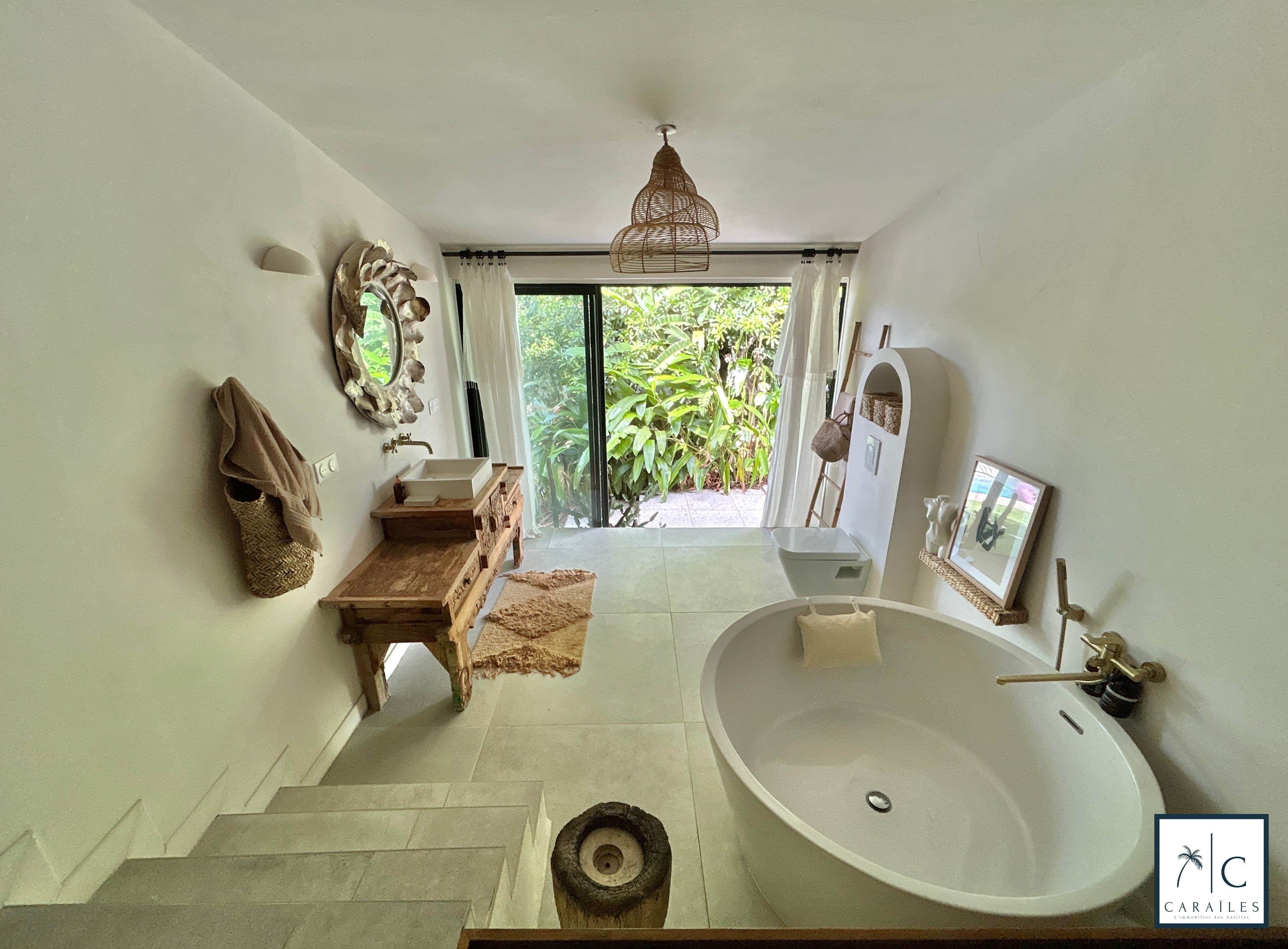 Le tout s’ouvre sur le jardin tropical, la piscine et un coin feu de camp sous le grand arbre - un lieu parfait pour les soirées en famille.